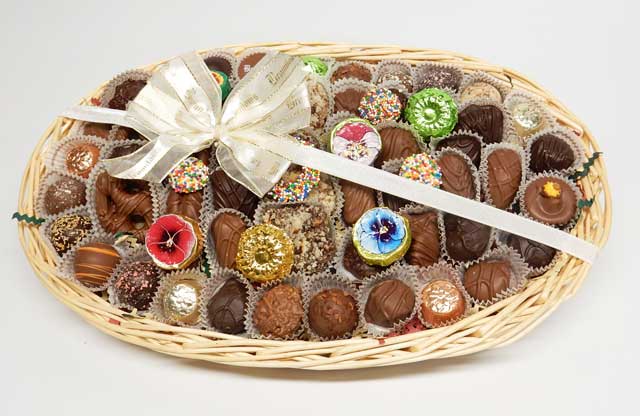 wicker gift tray of milk, dark and white assorted chocolates including butter crunch,mini pretzels, truffles, solids, and our general assorted filled chocolates.